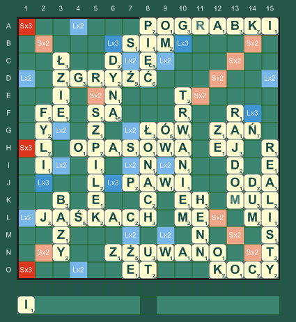 | po krótkiej analizie zauważyłem, że była szansa na rekord! należało w przedostatnim ruchu położyć FLIZY (+5 pkt), a w ostatnim GIŃ/SIMI (+11) co po końcowym rozliczeniu dałoby 728 pkt! tyle, że s± dwa ale - Robert mógł położyć np. RADO(W)EJ/EHE/MEJ zamiast przedostatniego ruchu no i trzeba by znać słowo SIMI | |||||