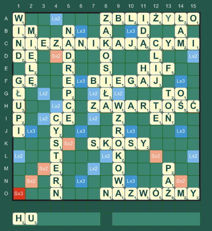 | kilka uwag:- w ostatnim moim ruchu można było zagrać lepiej: GUPIkU (+9 pkt.) i na odjęciu o 3 mniej czyli miałbym 546 pkt.,- partia miała miejsce pomiędzy 3 a 4 w nocy! w 11. rundzie nocnego pożegnania z Paśnikiem,- zauważone ciekawostki: najwyższy wynik zawodnika: 793 pkt., najwyższy wynik przegranego: 532 pkt., najwyższa suma: 1325 pkt., drogi ruch: 293 pkt., osiem premii i piętnastoliterowiec. | |||||